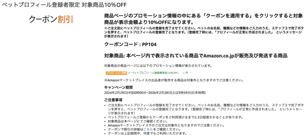 Amazonの「ペットプロフィール」を作成しておくと、対象のペット用品が10%OFFになるキャンペーンが実施されることがあります。