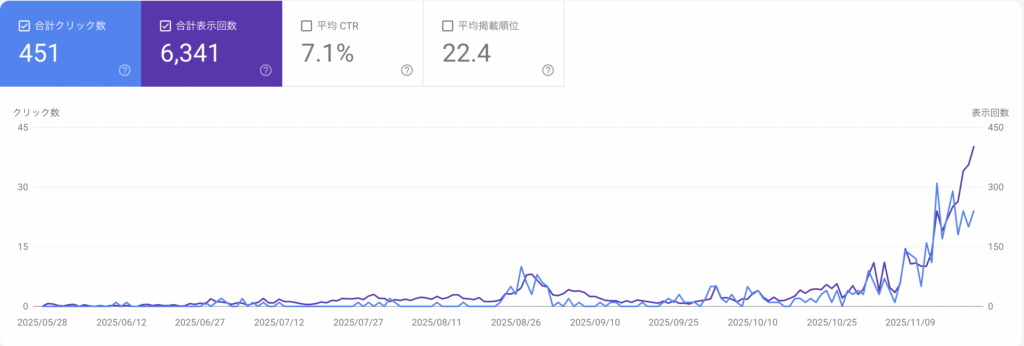 記事は公開してから3〜6ヶ月で評価が反映されることが多く、ようやく検索順位が上がり始めたことで、大量の表示が生まれるようになるそうです。