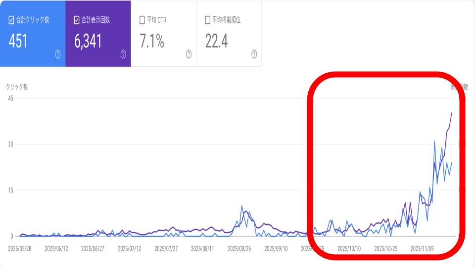 これは、ChatGPT曰く「これまで積み上げてきた記事がGoogleに評価され始めたタイミング」とのこと。