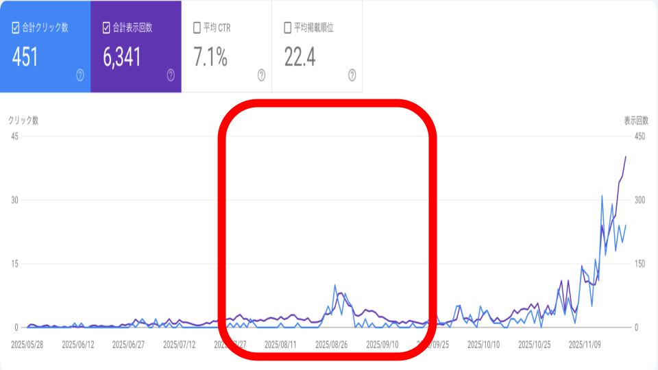 この“評価待ち期間”が続くため、記事を書いてもなかなか検索流入が増えない状態でした。