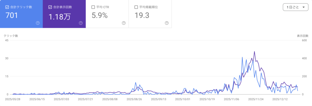 特に、検索意図を意識した記事設計・内部リンク導線の改善・季節トレンドの活用という3点が、表示回数やクリック数の伸びにつながった要因だと感じています。
