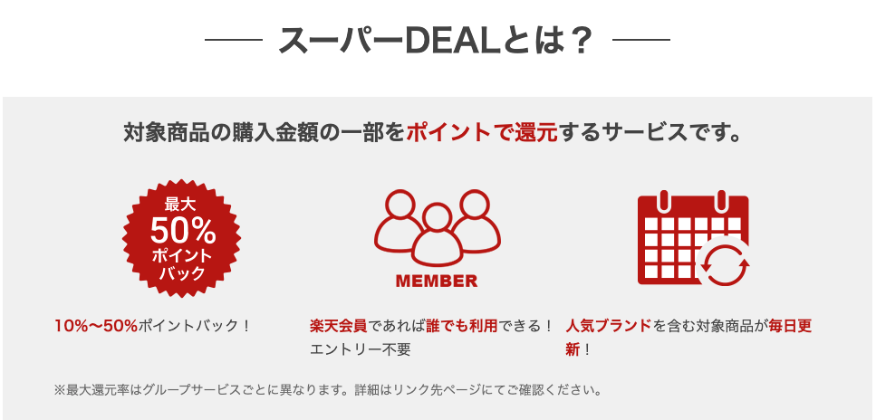 楽天スーパーDEALとは、購入金額の一部がポイントとして還元されるプログラムです。