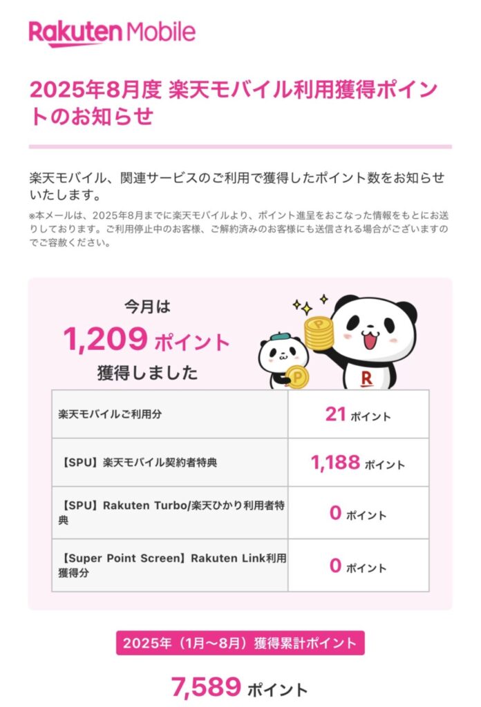 楽天モバイルに契約していたことにより、2025年1月〜8月まででおよそ7,589円分のポイント還元を得ることができました。