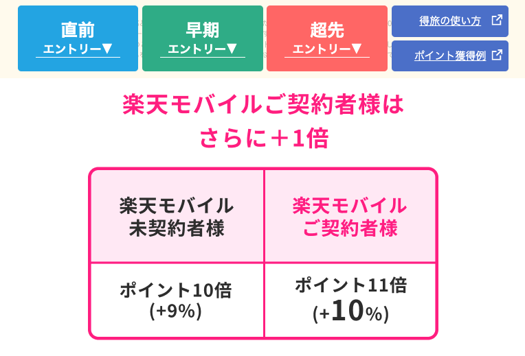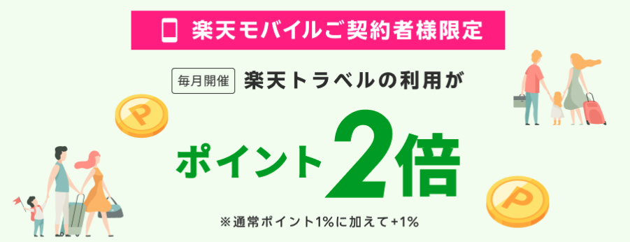 楽天モバイル契約者は、楽天トラベルの利用でポイントが2倍になるキャンペーンや、早期予約でお得になる得旅キャンペーンでもさらにプラス1倍となります。