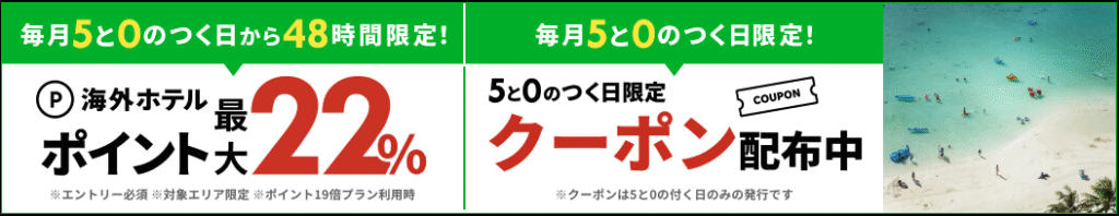 楽天トラベルでは、毎月5と0のつく日に限定クーポンを配布している他、お得なクーポン祭やボーナスクーポンフェスタなど、クーポンを多数配布しています。