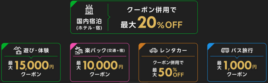 国内宿泊で最大20%OFFとなる他、遊び・体験では最大15,000円、楽パック(交通+宿)で最大10,000円、レンタカー最大50%OFFになるクーポンが配布されます。