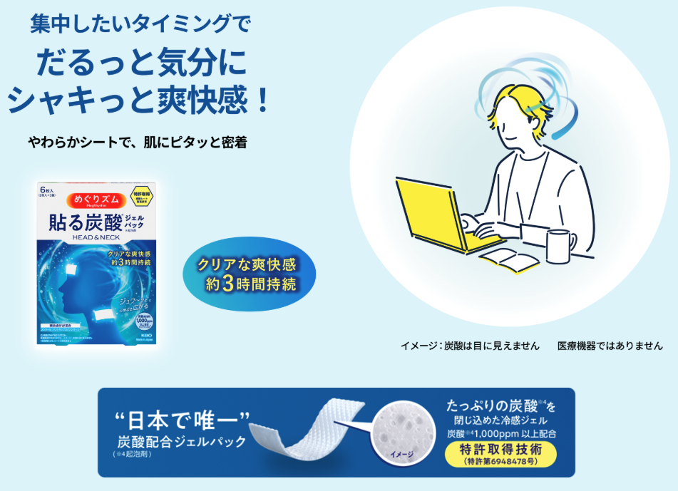 炭酸を配合した冷感ジェルパックは、Kaoさんの特許取得技術であり、顔や首に貼ると気持ちのいい爽快感がおよそ3時間持続します。