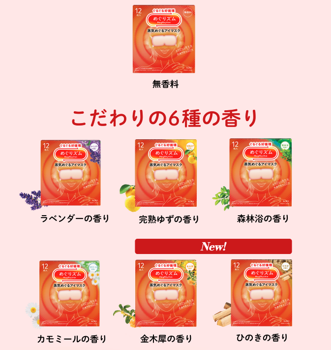 これまでの無香料、ラベンダー、ゆず、森林浴、カモミールに加え新しく「金木犀」と「ひのき」の香りが登場!