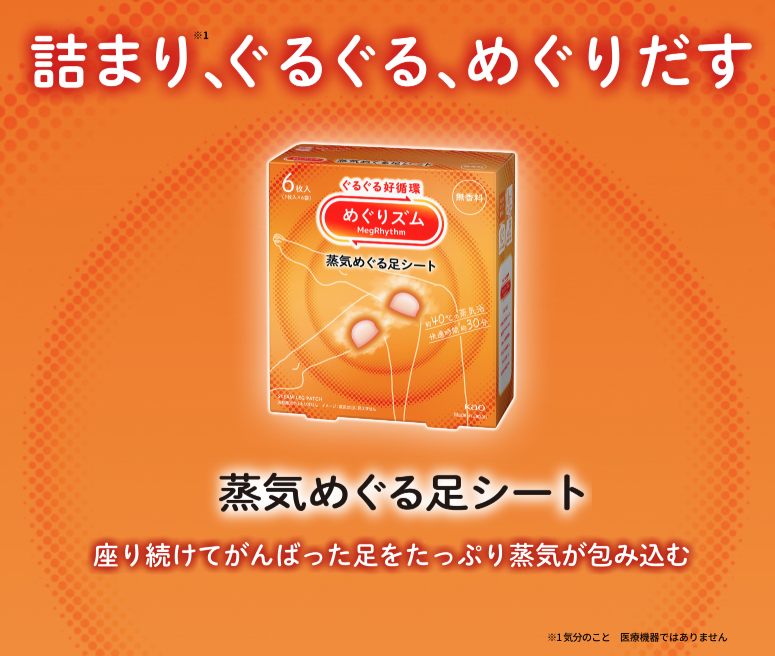 座り続けて固まってしまった足や、移動疲れのリフレッシュに蒸気めぐる足シートがおすすめです。