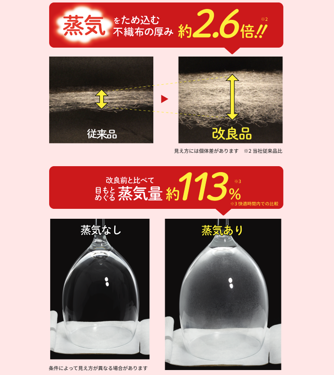 従来品と比較し、新しいめぐりズムは蒸気を溜め込む不織布の厚みがおよそ2.6倍にアップ。